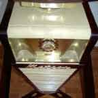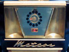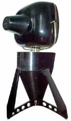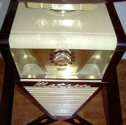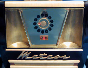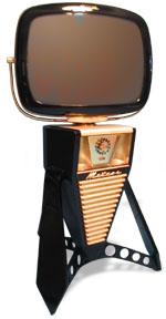 The Meteor is for those seeking a television that's on par with the elevated aesthetic of their living space. Its departure from the rectangular form of the classic Predicta TV breaks into new design territory -- pushing the envelope of television design and materials. This product is about style. The aircraft-inspired legs and struts lift the design. Their unique form gives the base a forward-facing bulldog stance, while the mass of the solidly anchored set appears to hover. The hand-built hardwood cabinet and legs are finished in hand-rubbed gloss black lacquer and accented by a maple top and grillwork. The 24-inch screen pivots on a polished CNC-machined brass collar, complementing the fine woodwork of the cabinet below. An acrylic-faced shadow box with polished brass back plate, bracketed by a pair of sculpted brass "air intakes", provides depth behind the lighted dial channel selector. The limited edition Meteor TV carries the Predicta legacy into the 21st century. |